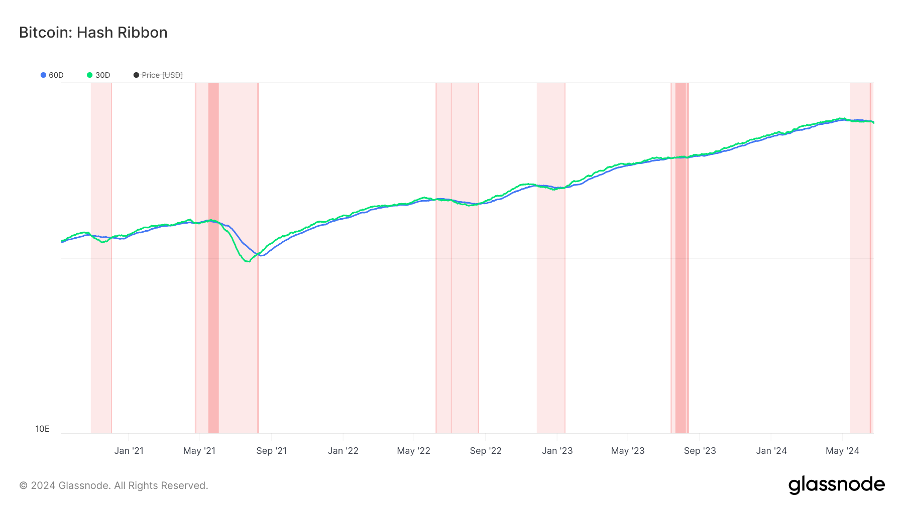 When the 30-day moving average of hashrate (green line) is less than the 60-day (blue line), it suggests miners are unplugging machines, either due to unprofitability or energy curtailments.