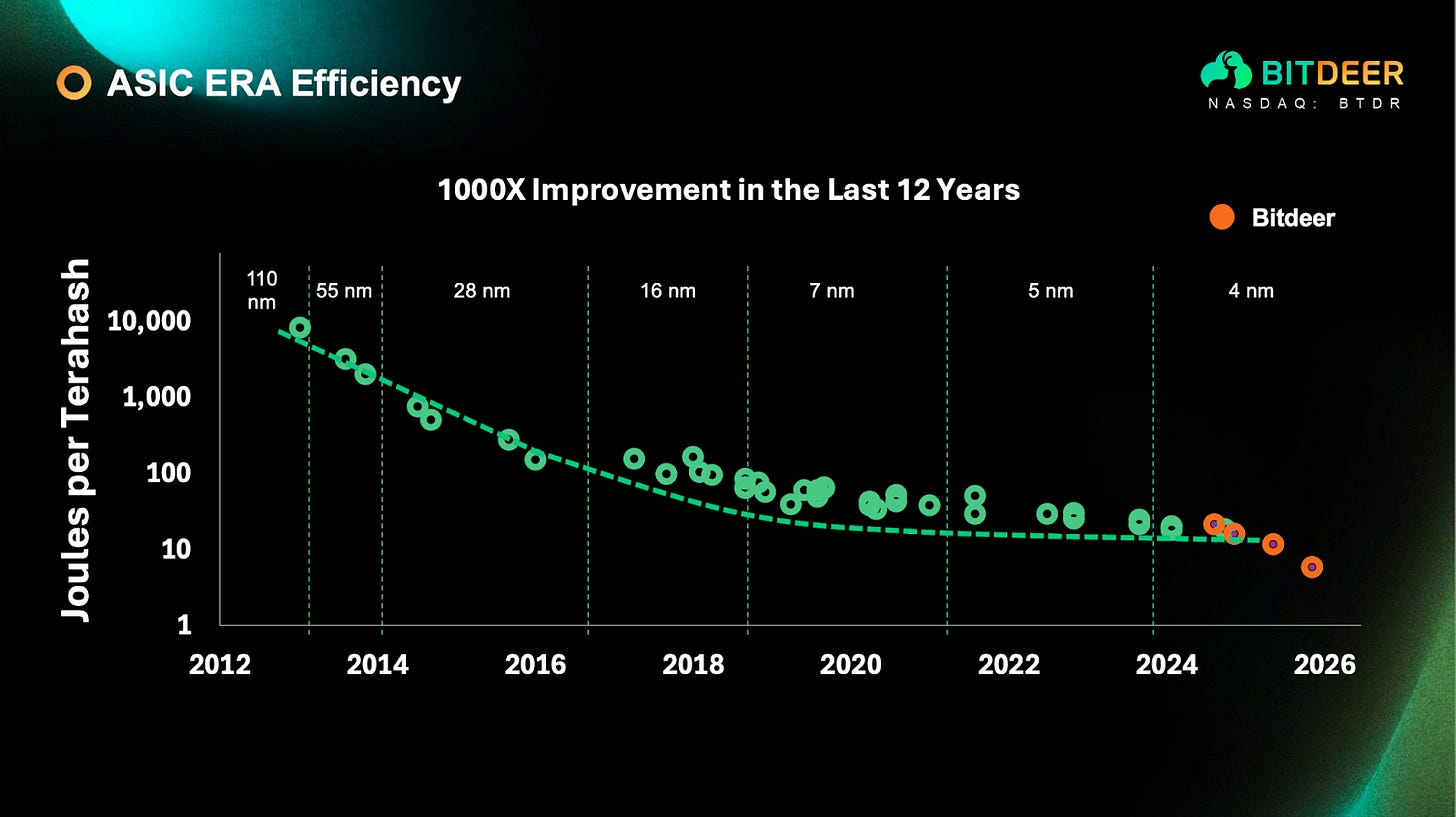 The industry moved from 150 J/TH to 15 J/TH over the past decade.