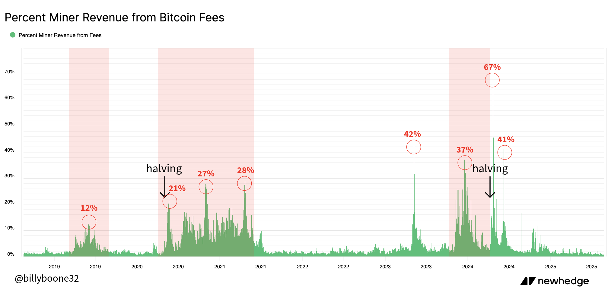 Around halvings, fee revenue has hit almost 70% of total miner revenue.