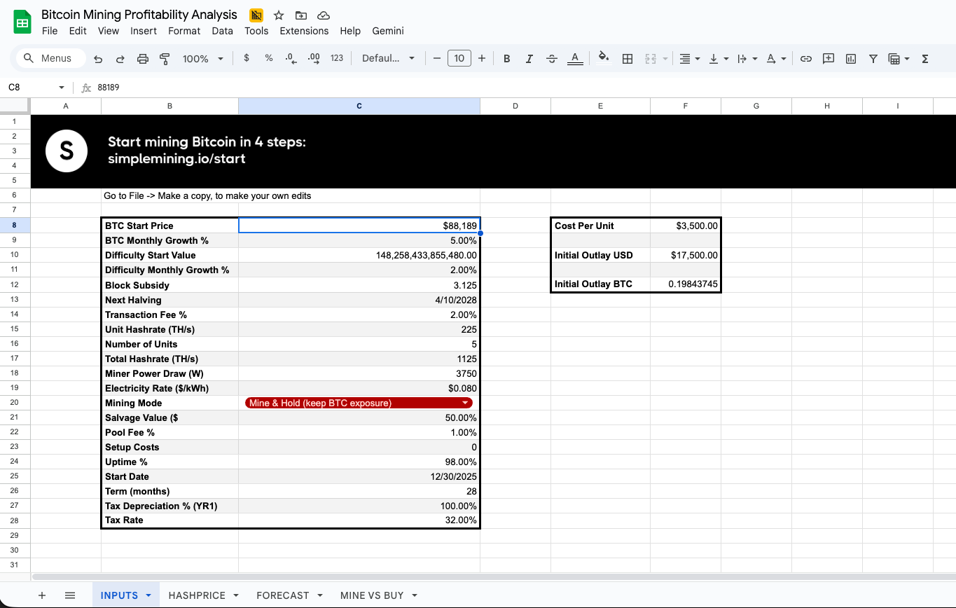 Fill in the inputs (the most important for FORECAST will be “BTC Monthly Growth %” and “Difficulty Monthly Growth %”)