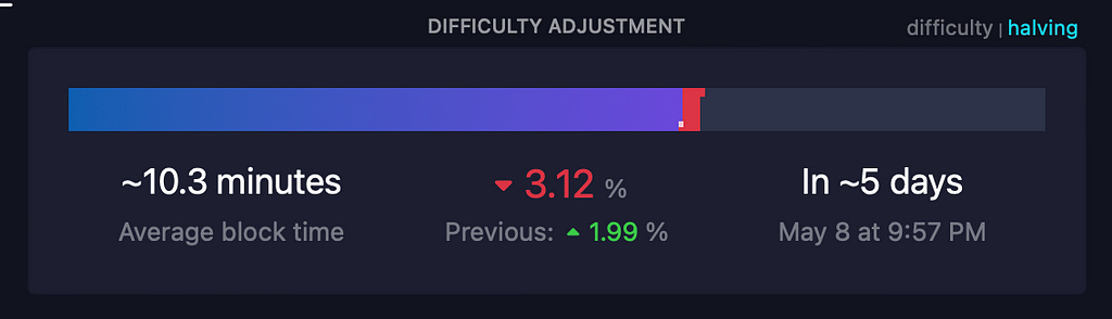As is stands right now, the next diffculty adjustment is projected to be negative as hashrate has come offline post halving and blocks are taking longer than 10 minutes on average.