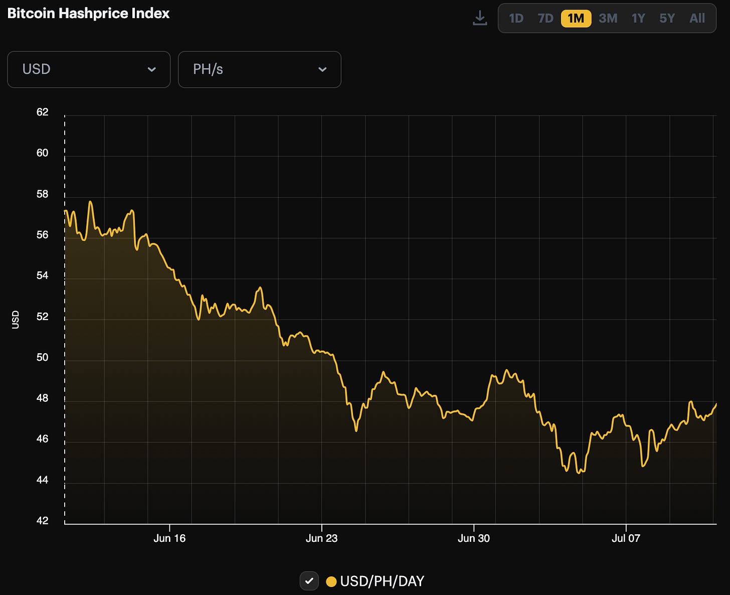 Hashprice bounced off its all-time low, falling to $44.31/PH/Day.