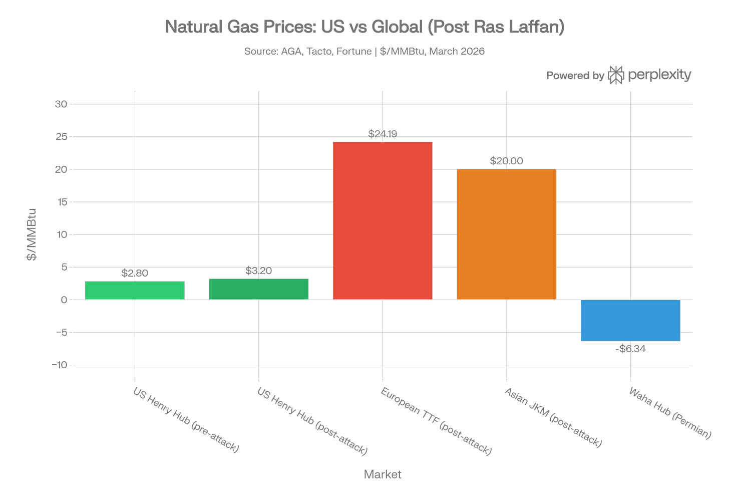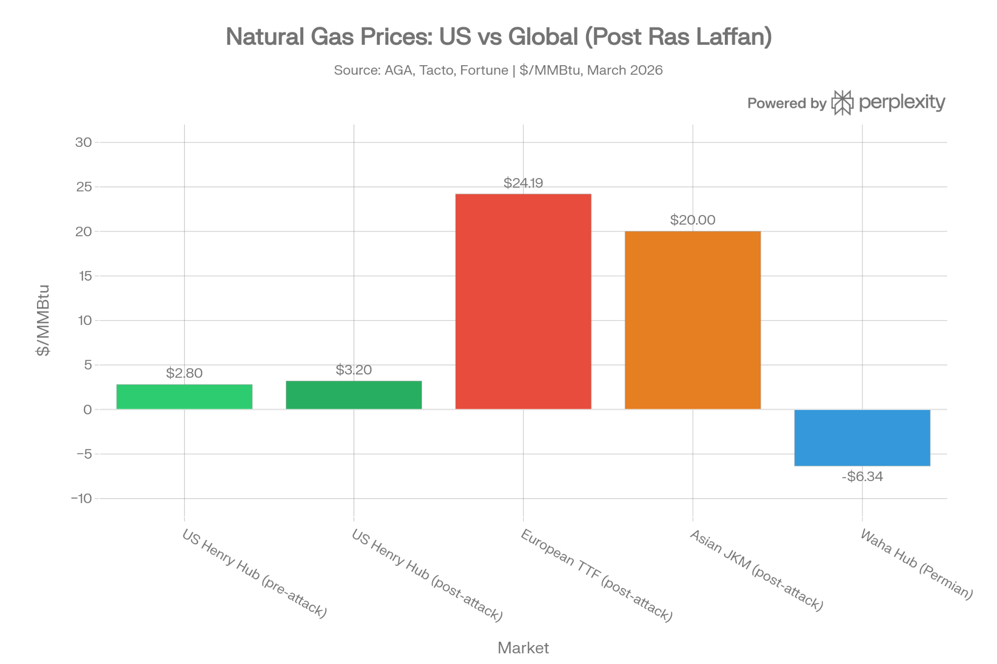 Henry Hub trades between $3.10 and $3.40/MMBtu since the war began. The EIA forecasts a 2026 average of $3.80. Why? US LNG export terminals are at full capacity. The gap left by Qatar cannot be filled by US exports. But that also means the global price spike does not drain US domestic supply. Export bottlenecks insulate Henry Hub from TTF and JKM.