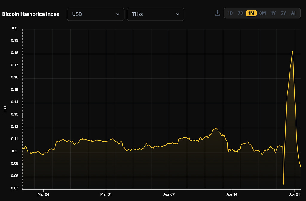 Hashprice is a metric revealing how much a miner can earn per unit of work(hash). As you can see, miners had a heyday over the halving.