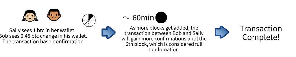 4. After the block containing Bob and Sally’s bitcoin transaction gets added to the chain, they will both see the bitcoin has arrived in their wallet with 1 confirmation. A confirmation is a successful block added that verifies the transaction.