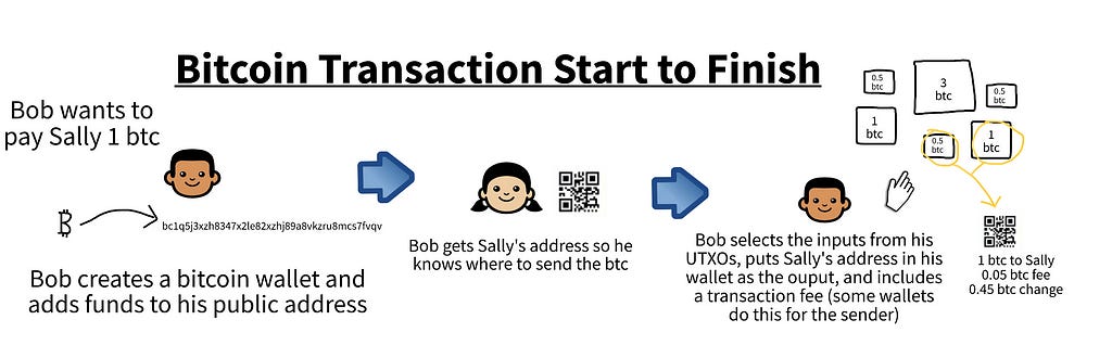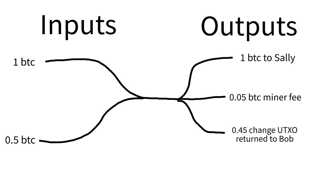 A transaction is created from UTXOs in Bob’s wallet. Bob uses his 1 btc and 0.5 btc UTXOs to pay Sally and cover the TX fee.