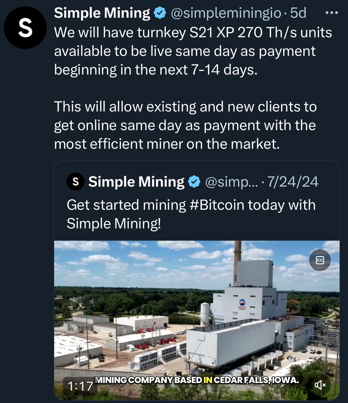 We also have S21 XP 270 Th/s units turnkey following our most recent expansion: