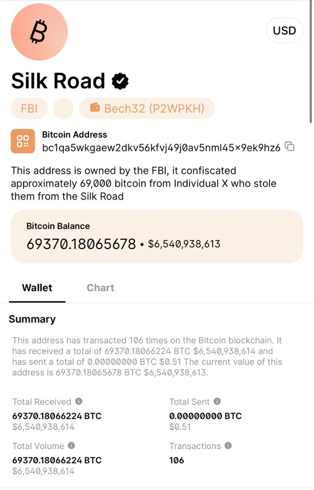 This BTC was part of the 170,000 BTC seizure from the Silk Road in 2013.